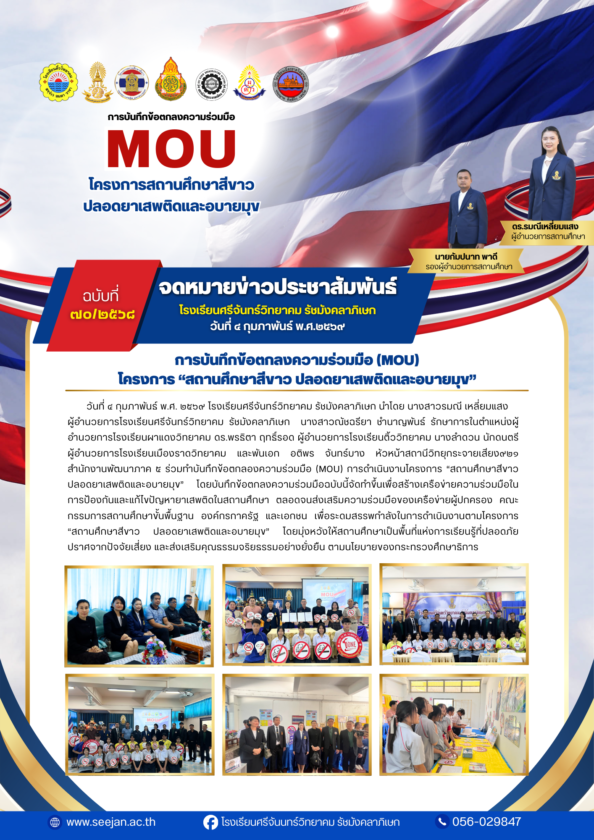 บันทึกข้อตกลงความร่วมมือ (MOU) 📄 การดำเนินงานโครงการ “สถานศึกษาสีขาว ปลอดยาเสพติดและอบายมุข” 5 กุมภาพันธ์ 2026เจษฎากร สร้อยมีจดหมายข่าว/กิจกรรมต่างๆ Post Views: 6FacebookFacebookXXLINELineShare this:Click to share on Twitter (Opens in new window)Click to share on Facebook (Opens in new window)Related