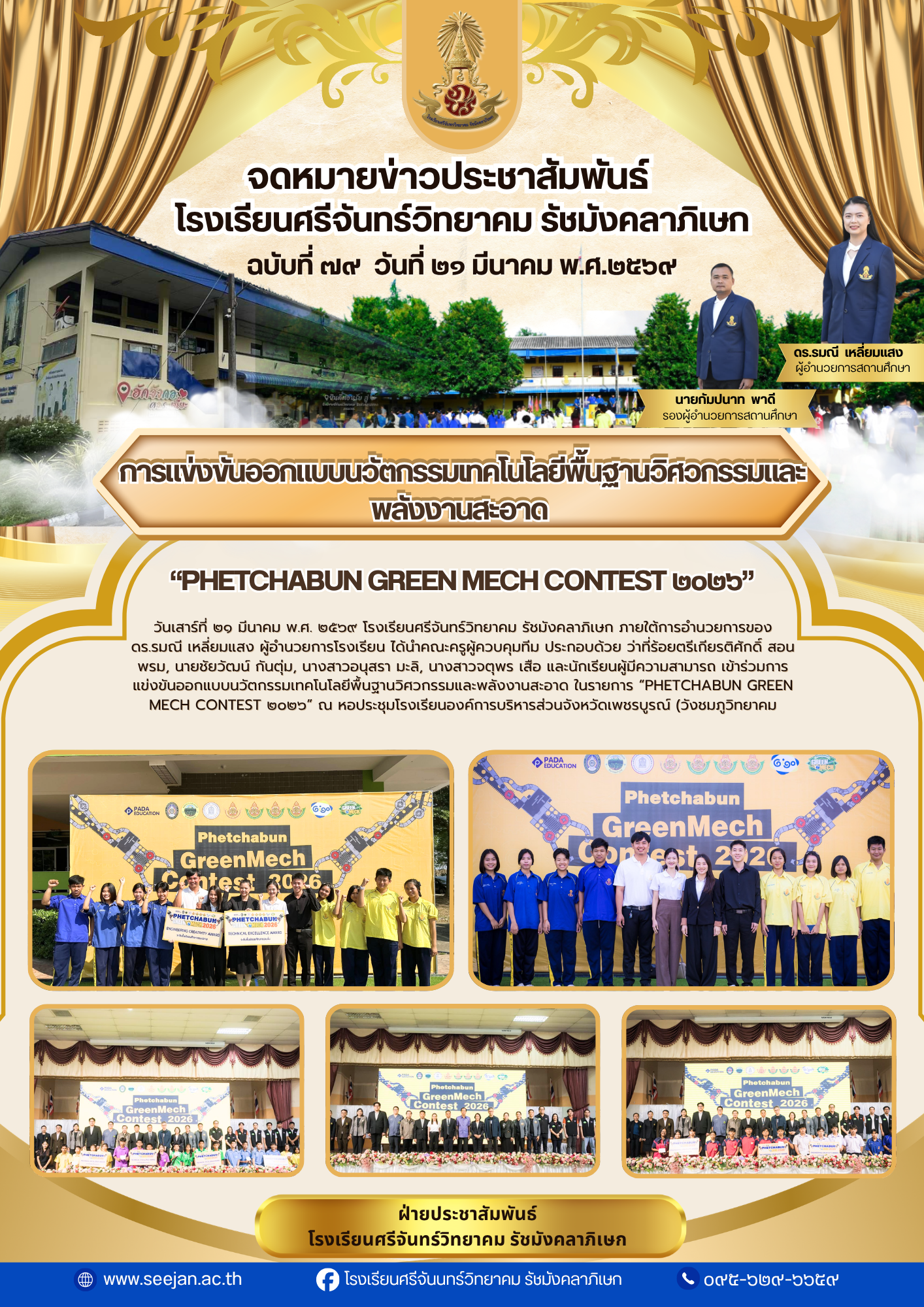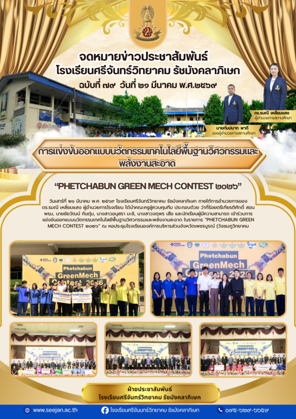 เข้าร่วมการแข่งขันออกแบบนวัตกรรมเทคโนโลยีพื้นฐานวิศวกรรมและพลังงานสะอาด ในรายการ “PHETCHABUN GREEN MECH CONTEST ๒๐๒๖” ณ หอประชุมโรงเรียนองค์การบริหารส่วนจังหวัดเพชรบูรณ์ (วังชมภูวิทยาคม 24 มีนาคม 2026เจษฎากร สร้อยมีจดหมายข่าว/กิจกรรมต่างๆ Post Views: 4FacebookFacebookXXLINELineShare this:Click to share on Twitter (Opens in new window)Click to share on Facebook (Opens in new window)Related