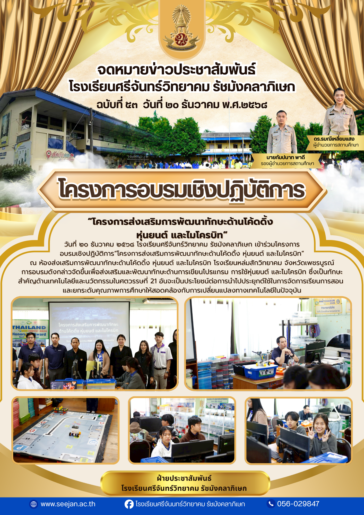 โครงการอบรมเชิงปฏิบัติการ “โครงการส่งเสริมการพัฒนาทักษะด้านโค้ดดิ้ง หุ่นยนต์ และไมโครบิท” วันที่ 20 เดือน ธันวาคม พ.ศ. 2568 20 ธันวาคม 2025เจษฎากร สร้อยมีจดหมายข่าว/กิจกรรมต่างๆ Post Views: 2FacebookFacebookXXLINELineShare this:Click to share on Twitter (Opens in new window)Click to share on Facebook (Opens in new window)Related