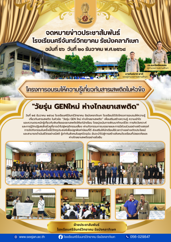 โครงการอบรมให้ความรู้เกี่ยวกับสารเสพติด ในหัวข้อ “วัยรุ่น Gen ใหม่ ห่างไกลยาเสพติด” 25 ธันวาคม 2025เจษฎากร สร้อยมีจดหมายข่าว/กิจกรรมต่างๆ Post Views: 2FacebookFacebookXXLINELineShare this:Click to share on Twitter (Opens in new window)Click to share on Facebook (Opens in new window)Related